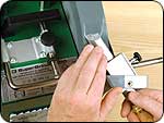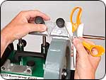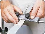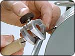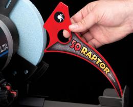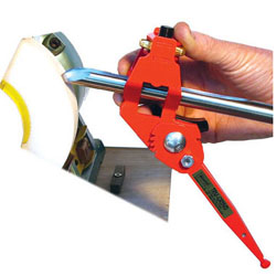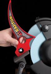 乾式グラインダーでも普及しているワンウエー2291(ウルバーリン・グラインデングジグ)のVアームのポケットとグラインデング・ホイールとの距離を一発で出すジグが市販されました。ボウル・ガウジやスピンドル・ガウジの場合は切刃角度が40度、45度、50度の3種類のそれぞれに写真のようにして、板状のセットアップツール”Raptor;ラプター”(特許申請済)を用いて行ないます。 |